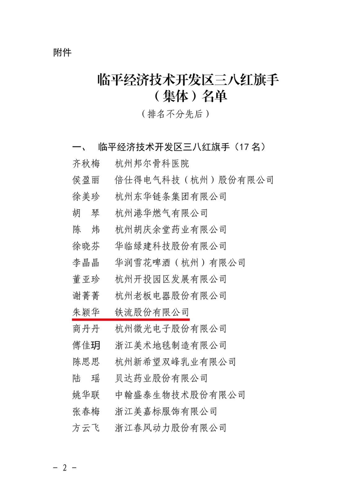 近日,临平开发区妇联开展2022-2023年度临平经济技术开发区三八红旗手(集体)推荐及评选活动。铁流股份综合管理部副主任朱颖华光荣上榜,荣获“开发区三八红旗手”。